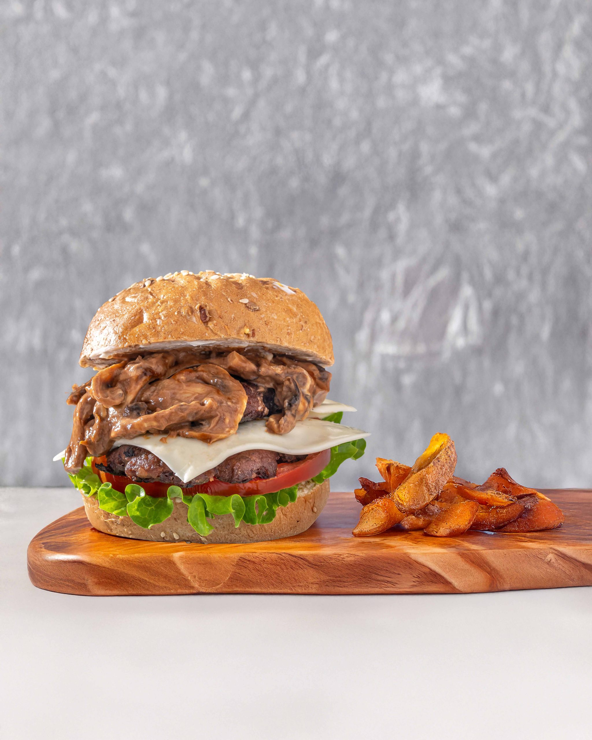 Kcal 550, protein 42gm, fats 28gm, carbs 30gm Grilled Angus beef topped with BBQ-glazed mushrooms and onions, melted cheese, fresh tomato, and Lolo Bionda, finished with BBQ sauce in a toasted brown bun.